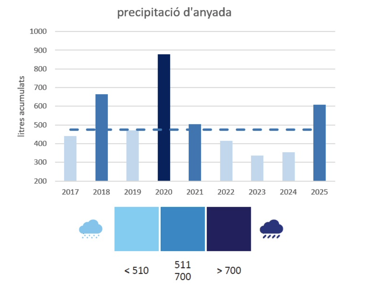 Després d’un 2018 i sobretot un 2020 excepcionalment plujós (amb el temporal Glòria), el 2022 confirma l’inici d’una sequera profunda que dura 4 anys i que no es reverteix definitivament fins al 2025.